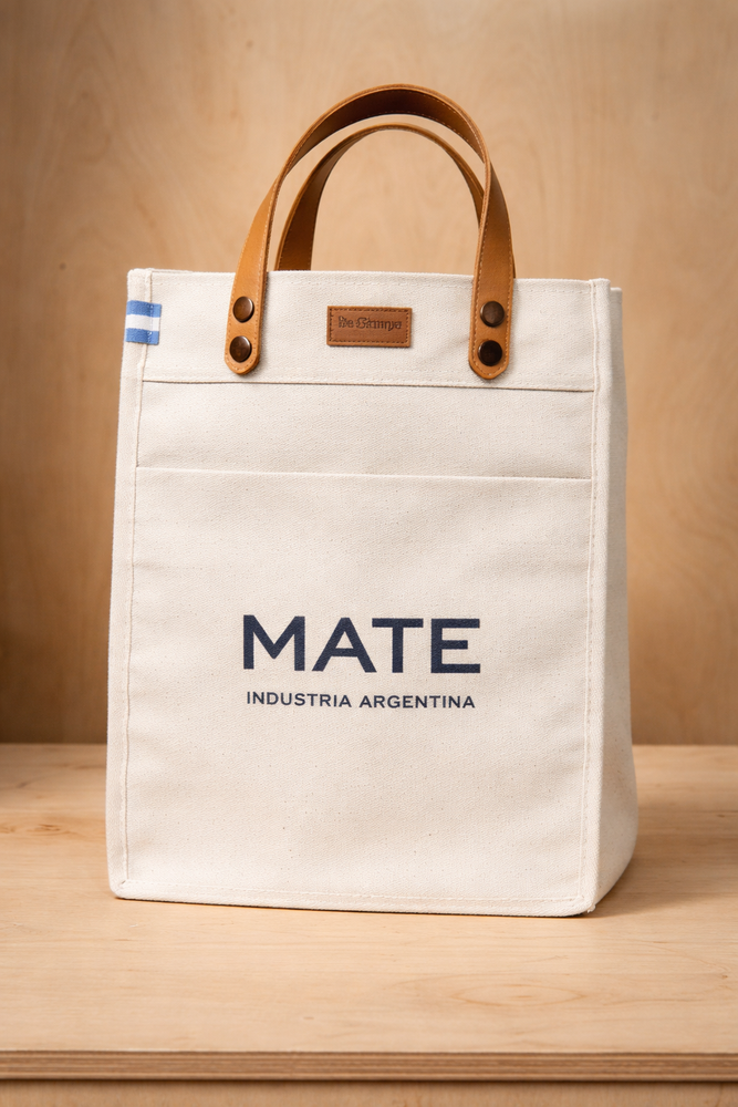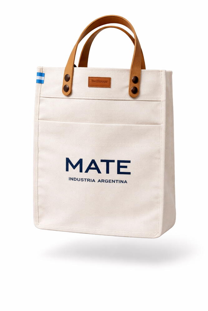 Matera confeccionada en Lona natural. Forreria en lienzo 100% algodon. Divisor interno para Termo (entra el Stanley) y mate + yerba. Correa regulable de algodon resistente para el hombro. Manijas de Cuero Vaqueta con sistema de broches desmontables (para facilitar el lavado) o fijos. Bolsillo frontal.
